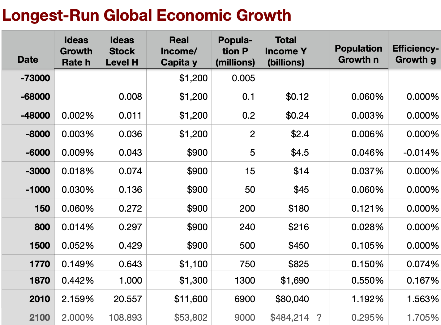 There are near-consensus guesses as to the average level of net output per worker and the size of the human population since deep time. Under the further assumption that the effective labor force is a constant share of the human population—that as the share of the population too young to work has fallen, the share that is retired has risen to approximately offset—the rate of labor-force growth is the same as the rate of population growth. And thus I can calculate my guesstimates of the rate of growth of h.