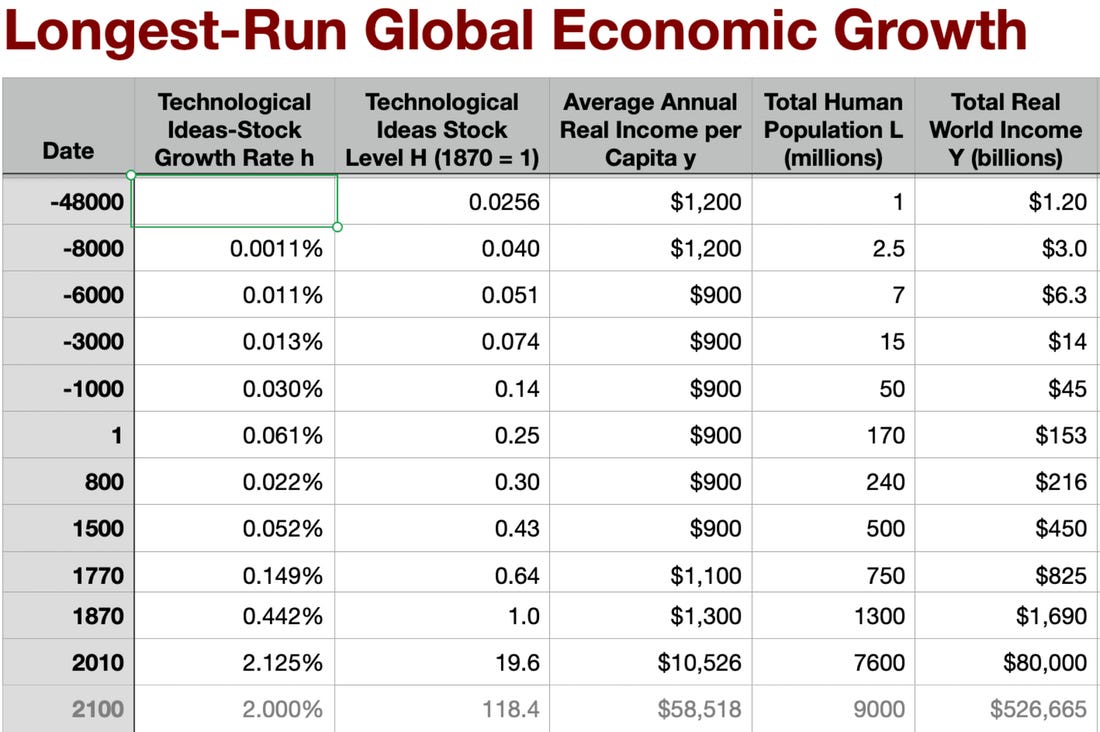 Instead of the near-tripling from the year 1 to the year 800 in population that the Axial Age of -1000 to 1 would have led us to expect, human population in 800 is less than 40% above population in the year 1. Ideas growth—and population growth—slowed drastically. From 1 to 1500, each person on the globe contributed only 1/6 as much to ideas growth. And it was still the case that essentially all improvements in technology flowed through to increasing population, with essentially none flowing through to higher labor efficiency, productivity, and living standards for the typical human.