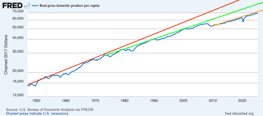 Had growth continued after 1973 at its post-WWII generation pace, annual real GDP per capita today would not be its current $70,000 but rather $100,000. And had growth continued after 2000 at its 1973-2000 pace, annual real GDP per capita today would not be its current $70,000 but rather $85,000. The post-1973 productivity slowdown, reinforced as it was by the investment drought and the midwestern manufacturing crisis brought on by the Reagan full-employment deficit spending episode was a huge deal for America. So was the post-GFC failure to get the economy back on its pre-GFC track, as that recession—uniquely in American history—triggered pronounced “hysteresis” and has cast a shadow on our prosperity today. The two are about equal in terms of making America much less than we could imagine, and than we did in earlier decades imagine it would be today.