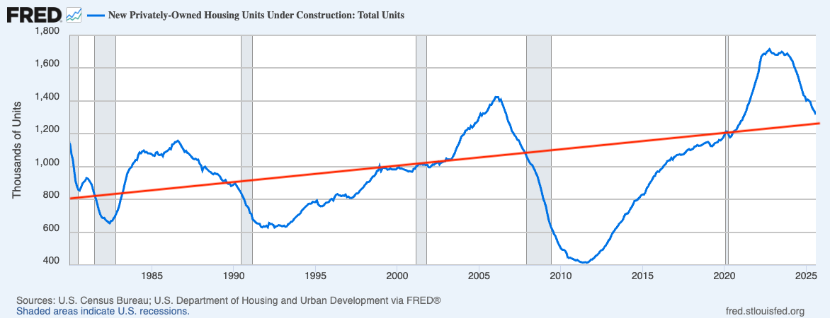 Adjusted for per-capita wealth, changing family sizes, and population growth, a “normal” America would have seen housing construction grow from some 600,000 units per year in 1980 to 1,200,000 units per year today. That is not what happened. Construction collapsed during theVolcker disinflation of the early 1980s and then boomed, collapsed again after the S&L failed deregulation crisis of 1990, and severely collapsed after the derivatives failed deregulation crisis of 2008 (notice a pattern?), which itself followed the housing boom of the 2000s, and then we had a YIMBY housing boom during the Biden years.