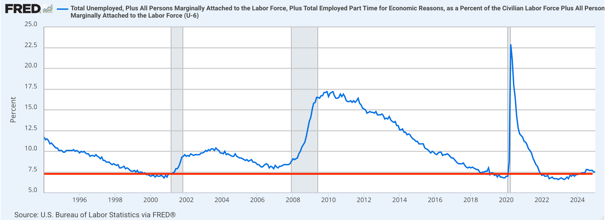 But the thing to focus on is that the labor market is, by all measures, better than it has been since the 1960s with the exception of the last Clinton year and the pre-plague Trump year. Those are the only moments in the past 55 years in which the U-6, indeed in which any of the unemployment measures, were rosier than they are now or were in the runup to the 2024 election.