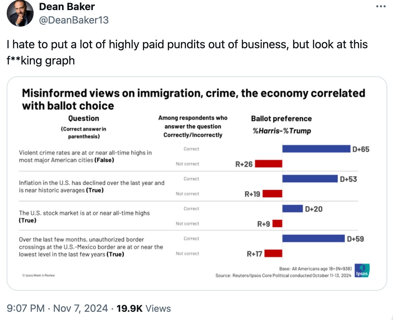 Fact: those with justified true beliefs about the state of issues like crime, inflation, immigration, and the state of the stock market overwhelmingly supported Harris.