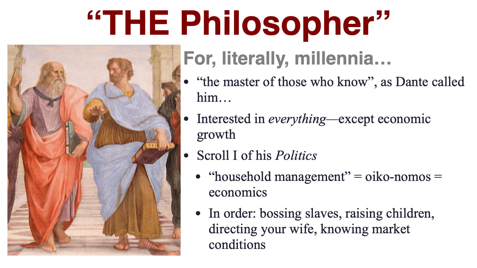 In the first book of his Politics, Aristotle talks about the necessity of owning slaves. It is, in fact, The first thing on his mind when he talks about managing resources on the part of the household—Greek oikos, household, and Greek nomos, organization or management. Hence oiko-nomos. Hence economics.