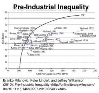 Branko Milanovic, Peter Lindert, and Jeffrey Williamson have estimated some numbers and drawn some graphs about inequality back in the agrarian age—that is, from 8000 B.C.E. to 1750 or so. It looks as though societies were by and large about as unequal as they could possibly be. Paying higher taxes or higher rents or higher tithes than were levied may indeed have meant that large numbers of children would die. Extracting more wealth would not have been an easy thing for an elite comprised of thugs with swords and grifters with fancy sacred headdresses to accomplish.
