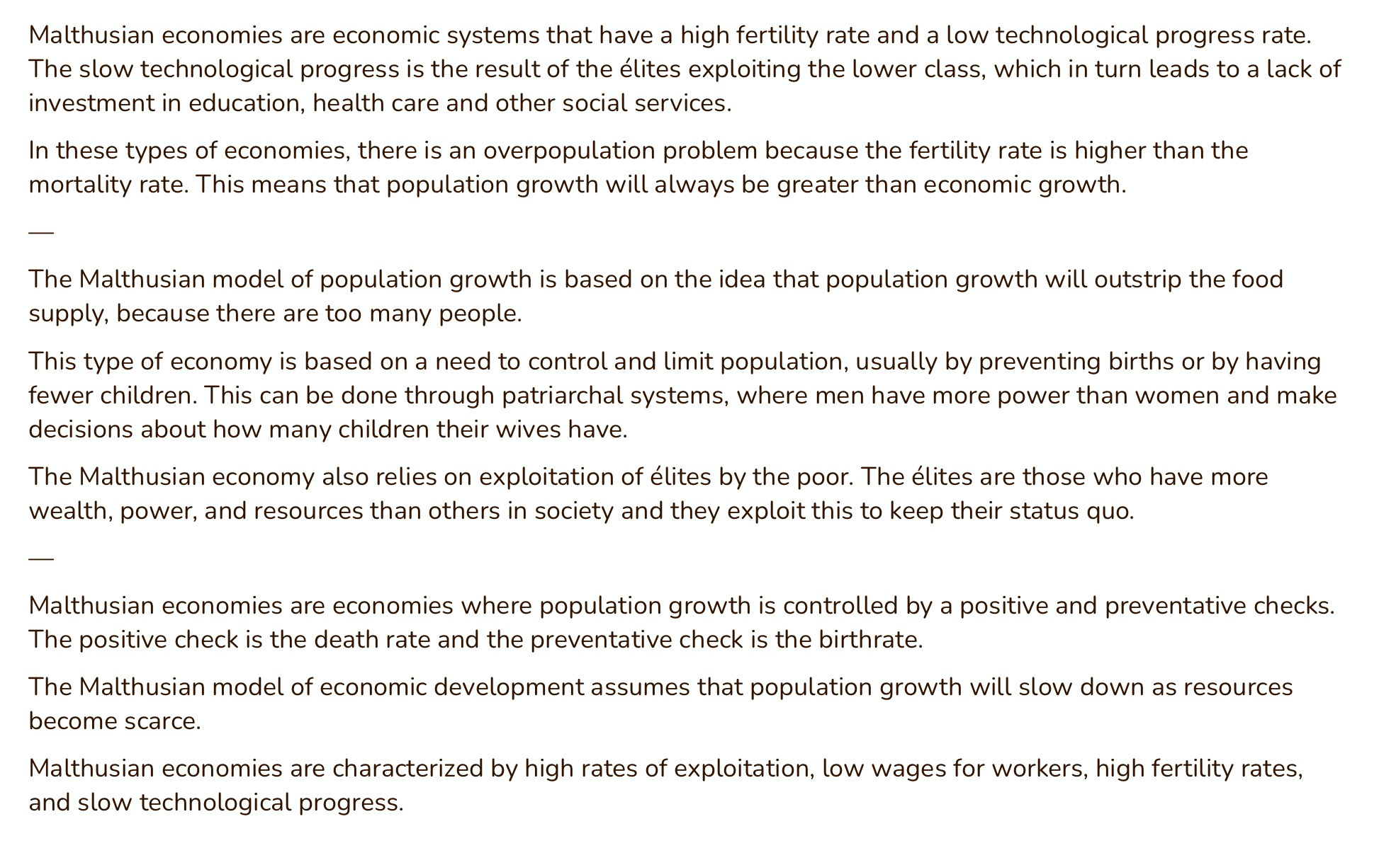 The prompt was “Malthusian Economies”, with keywords: fertility, slow technological progress, élites, exploitation, fertility, patriarchy, positive check, preventative check.