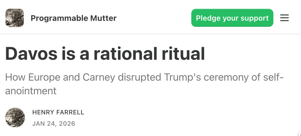 Henry Farrell: Davos is a rational ritual <https://www.programmablemutter.com/p/davos-is-a-rational-ritual>: ‘How Europe and Carney disrupted Trump’s ceremony of self-anointment…. You could see this shift happening in real time in the public statements of Trump administration officials…. What we have seen at Davos over the last few days was an effort by the Trump administration to create new common knowledge in the world, an agreement that Trump was in charge, and that politics revolved around him. That effort has failed because of pushback from politicians, both Europeans who were furious at Trump, and Canada’s prime minister, Mark Carney who gave a quite extraordinary speech. However, the result is most certainly not a decisive victory for Europe, Canada, and the other forces allied with them. Instead, it is one significant moment in a longer story of struggle and contention. Chwe argues that rituals are about creating coordinated expectations, and that this is why they are often an exercise in power…