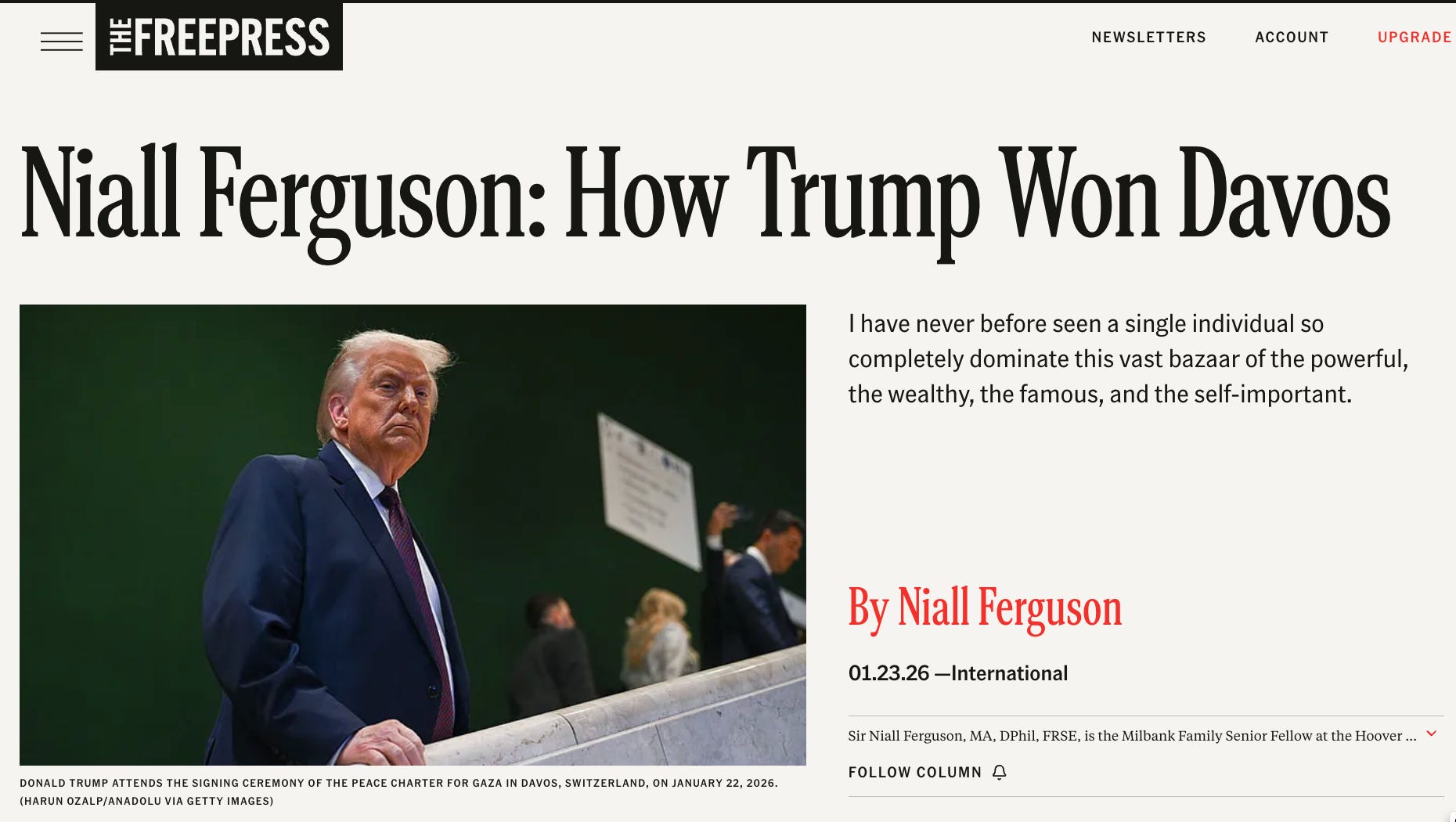 Niall Ferguson: How Trump Won Davos <https://www.thefp.com/p/niall-ferguson-how-trump-won-davos>: ‘I have never before seen a single individual so completely dominate this vast bazaar of the powerful, the wealthy, the famous, and the self-important…