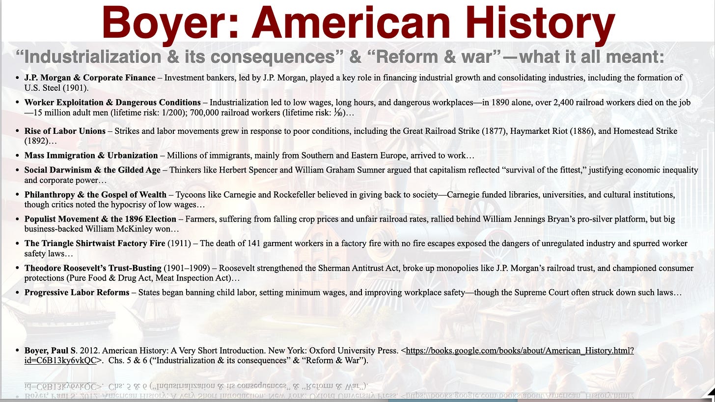 Boyer, Paul S. 2012. American History: A Very Short Introduction. New York: Oxford University Press. <https://books.google.com/books/about/American_History.html?id=C6B13ky6vkQC>. Chs. 5 & 6 (“Industrialization & its consequences” & “Reform & War”).