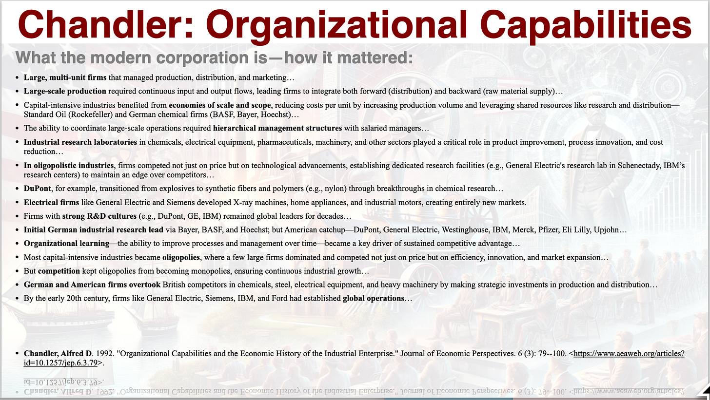 Chandler, Alfred D. 1992. "Organizational Capabilities and the Economic History of the Industrial Enterprise." Journal of Economic Perspectives. 6 (3): 79--100. <https://www.aeaweb.org/articles?id=10.1257/jep.6.3.79>.