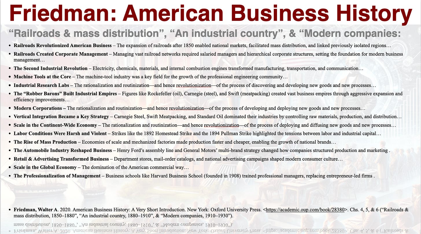 Friedman, Walter A. 2020. American Business History: A Very Short Introduction. New York: Oxford University Press. <https://academic.oup.com/book/28380>. Chs. 4, 5, & 6 (“Railroads & mass distribution, 1850–1880”, “An industrial country, 1880–1910”, & “Modern companies, 1910–1930”).