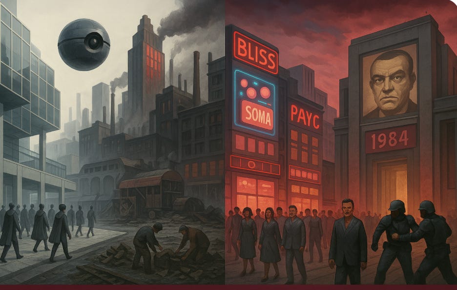 And then, inevitably, we arrive at the dystopias—those cautionary tales where the utopian impulse curdles into something far more sinister. Consider: