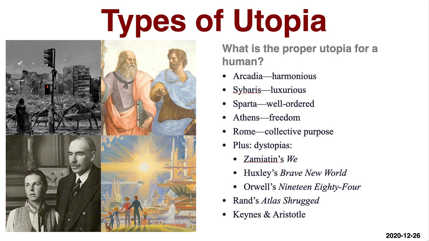 I have never given this “utopia” lecture. In every course I have ever taught, it has been one single slide. Thus it has only been five minutes, a maybe a few more. It would have taken an hour. And I never had an hour.