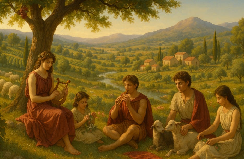 This is the Arkadian ideal—a notion popularized by Virgil, who romanticized a rural Greek backwater into a symbol of pastoral simplicity and happiness. Arkadia, in the classical imagination, was a land where shepherds played their pipes, communities were egalitarian, and existence was untroubled by the corrupting influences of wealth and ambition.