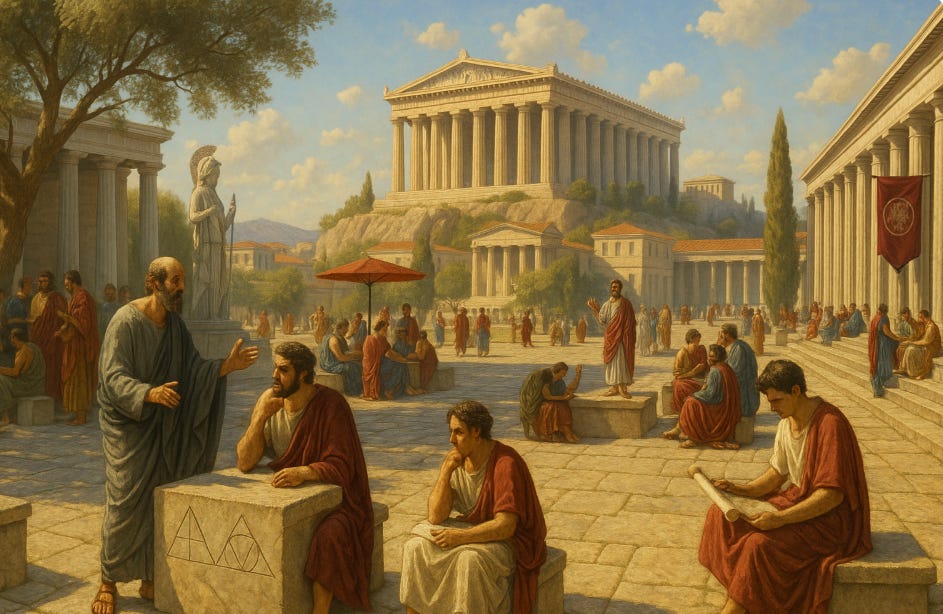 There is, of course, another vision of utopia—one that departs sharply from the rigid order of Sparte or the bucolic innocence of Arkadia. Here, the ideal is not discipline or simplicity, but openness: a society built on freedom of thought, robust debate, and the contestation of ideas. This is the city of the Athenai, at least in the image that its -400s leader Perikles tried to make its people live up to. And ever since, at least in the imagination of the streams of culture that have flowed from it, Athens has been the polis where free speech (parrhesia—speaking frankly, openly, and boldly; fearless candor as a duty) and democratic participation were elevated, at least for the privileged cohort of male citizens, to the highest civic virtues.