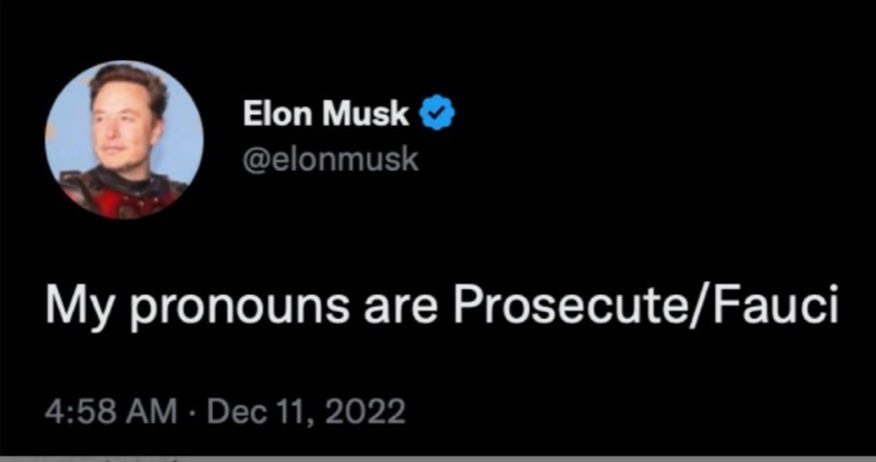 Matt Yglesias: Elon Musk is the latest victim of the online ragetrap: Don’t spend all day nursing grievances and making yourself miserable: ‘The other day, Elon Musk joked on Twitter that “my pronouns are Prosecute/Fauci.” It’s a mean spirited joke from Musk, who we already know enjoys mean jokes about trans people—the suspension of the Babylon Bee for making a mean joke about Rachel Levine was an important motivator of Musk’s decision to buy Twitter…. The pronouns thing references a genuine dispute in American politics and culture. Small numbers of people really are using they/them pronouns or socially transitioning from she/her to he/him, and if someone wants to spend their time being angry about that then I think that’s a weird decision, but they are, in fact, choosing to be angry about a thing that is happening…. But if you’re sitting here in mid-December 2022 getting mad at Fauci and Biden for imposing repeated rounds of lockdowns, then you’re getting mad about something you made up. A pseudonymous wag using the handle @ToiletGun quipped a couple of years ago that “Twitter is 90% someone imagining a guy, tricking themselves into believing that guy exists and then getting mad about it”…