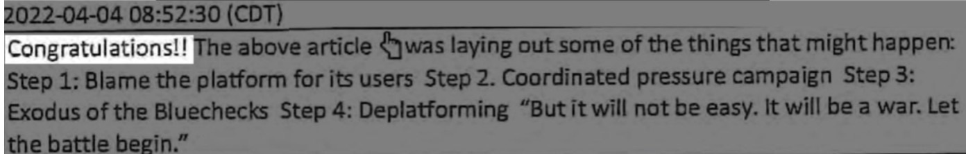 <https://www.revolver.news/2022/04/elon-musk-buy-twitter-free-speech-tech-censorship-american-regime-war/>: “Transforming Twitter back into a real free speech platform would represent nothing less than a declaration of war against the Globalist American Empire…. If Elon Musk bought Twitter and did nothing more than return it to the speech norms it had ten years ago, that act alone would constitute a ‘national security threat’, The threat posed to America’s joke institutions and the clowns who run them would be, in fact, existential…”