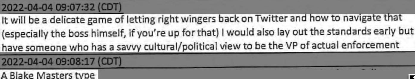“Emulate Blake Master” and “delicately let the neo-Nazis back on Twitter” are not the only pieces of advice Musk was given. The interlocutor had, 15 minutes before the “Blake Masters” signal, advised Musk thus with respect to his takeover of Twitter: