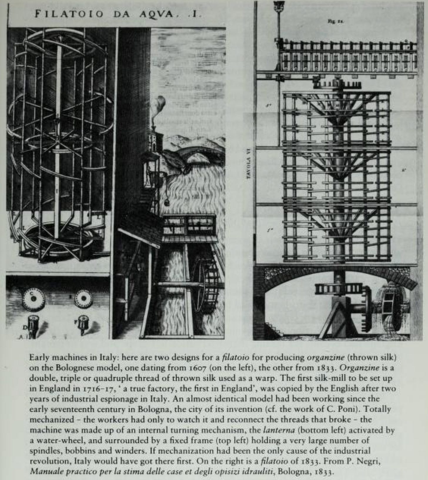 Hence the question put by our informant and guide Renato Zangheri: why did this substantial transformation of both the industry and the countryside of Milan and Lombardy come to nothing? Why did it not lead to an industrial revolution? Neither the infant technology of the time nor the lack of energy supplies seems an adequate explanation. "The English industrial revolution was not based on any scientific or technical progress not already available in the sixteenth century.: Carlo Poni was astonished to discover the sophistication of the hydraulic machines used in Italy to throw, spin and mill silk, with several mechanical processes and rows of spindles all turned by a single water-wheeel.