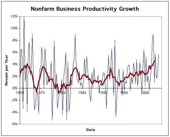 I'M NOT AS SMART AS I THOUGHT I WAS: Ah. I thought--from GDP and aggregate hours data--that we would have a 4% per year productivity growth quarter in the spring of 2003. I was wrong: we had a 5.7% per year productivity growth quarter. It is amazing that nonfarm business hours worked can fall--and fall at a 2.2% annual rate--in a quarter in which nonfarm business output can rise at a rate of 3.4% per year. If only we had demand rising fast enough to employ more rather than fewer people, the performance of the American economy would be truly amazing…