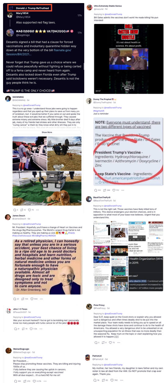 The response? So far, he has gotten 5,982 replies on Truth Social. If there is a single pro-vaccine one among them, I have not paged down enough to find it. Here are ten of them, selected at random from the current first page of results: