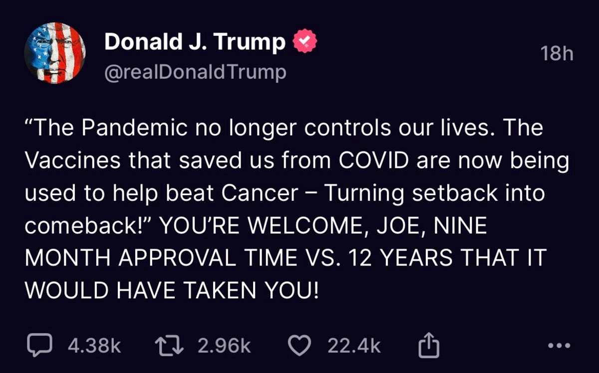 Ron Filipowski tells us that: “In the first major rallies of his post-presidency in 2022, Trump incorporated into his standard speech a few lines about how great the vaccine was and how he should get all the credit for them…” But he got booed and jeered, and then he cut the Warp Speed lines out of his standard speech.
