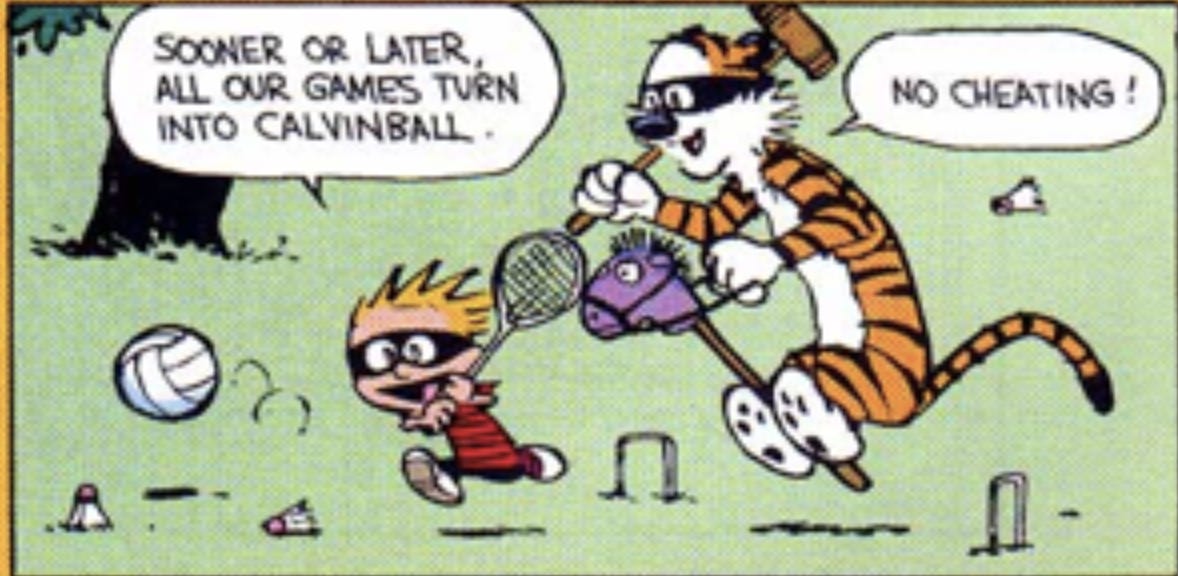Calvinist Monetary Economics: Aha. In his latest op-ed, John Taylor comes out as a full-fledged monetary Calvinist. No, not a disciple of John Calvin, the preacher — a disciple of Calvin of Calvin and Hobbes…. Mike Konczal felicitously made that analogy to discuss the people who were calling for a rise in interest rates despite high unemployment and low inflation — a group at the time exemplified by Raghuram Rajan. For those who don’t read the classics, Calvinball is a sport in which you change the rules whenever you feel like it, very much including in the middle of games. Back then the tight-money types were inventing new and peculiar principles of monetary policy on the fly; it was obvious that they were looking for some reason, any reason, to justify a rise in rates, because, well, because.