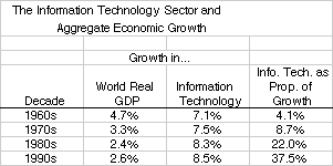 Estimates using the relative prices of the late 1980s assign information technology about three-eighths of world economic growth (estimates using later relative prices find smaller, and those using earlier relative prices larger, proportions).