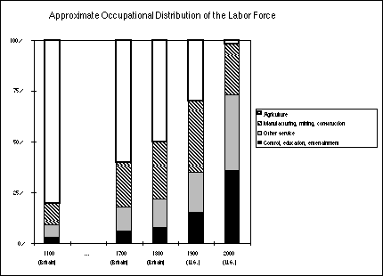In industrial and post-industrial economies, the share of the labor force in information-intensive activities grows rapidly: education because an industrial economy requires a trained workforce, entertainment because of new technologies, and control to manage the distribution of industrial wealth.