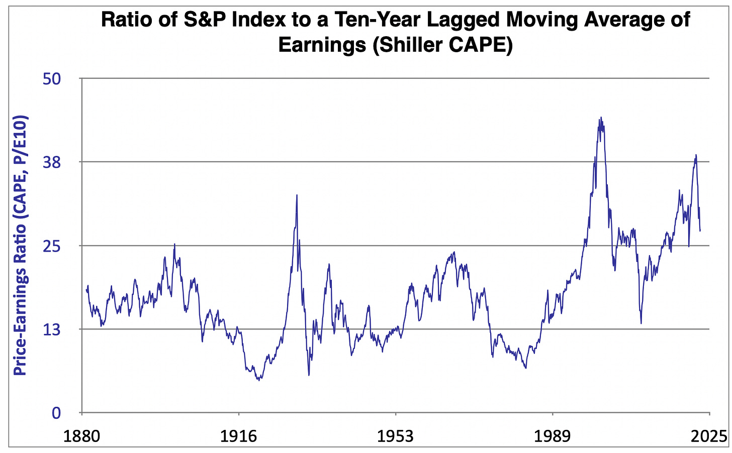 In the 1990s, this Shiller CAPE index fluctuated between 14 and 44, with an average near 20, corresponding to a 5% real profit rate. Since the year-2000 collapse of the dot-com bubble, this Shiller CAPE index has fluctuated between 14 (at the nadir of the 2008-9 financial crisis) and 38 (at the recent market peak), with an average of 27 during the secular-stagnation era and 30 in the decade after the Great Recession: