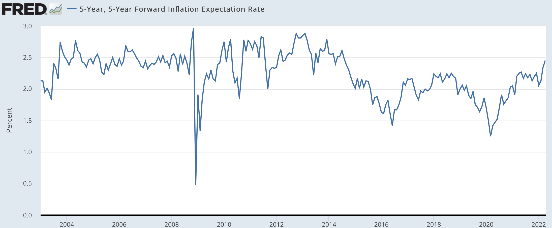 Brad DeLong: ’I am not sure that the supply/demand division framing makes a lot of sense. Inflation is the result of a supply/demand mismatch. This mismatch could be transient and healthy—a side effect of the good things of rapidly rejoining highway traffic at speed and wheeling the economy toward a more goods- and deliverator-heavy configuration. This mismatch could be long-lasting and unhealthy. The question is which. And the answer to that question turns on whether the economy has lost its expectational inflation anchor: Do people still expect inflation to be about 2%? Or do people think inflation is up-for-grabs and recent past inflation (or recent past plus a little more) is your best guess for what inflation will be in the future? My bet is that the 5/5 series from FRED is our best guide to what the relevant people are thinking. & the 5/5 has not (yet) moved…