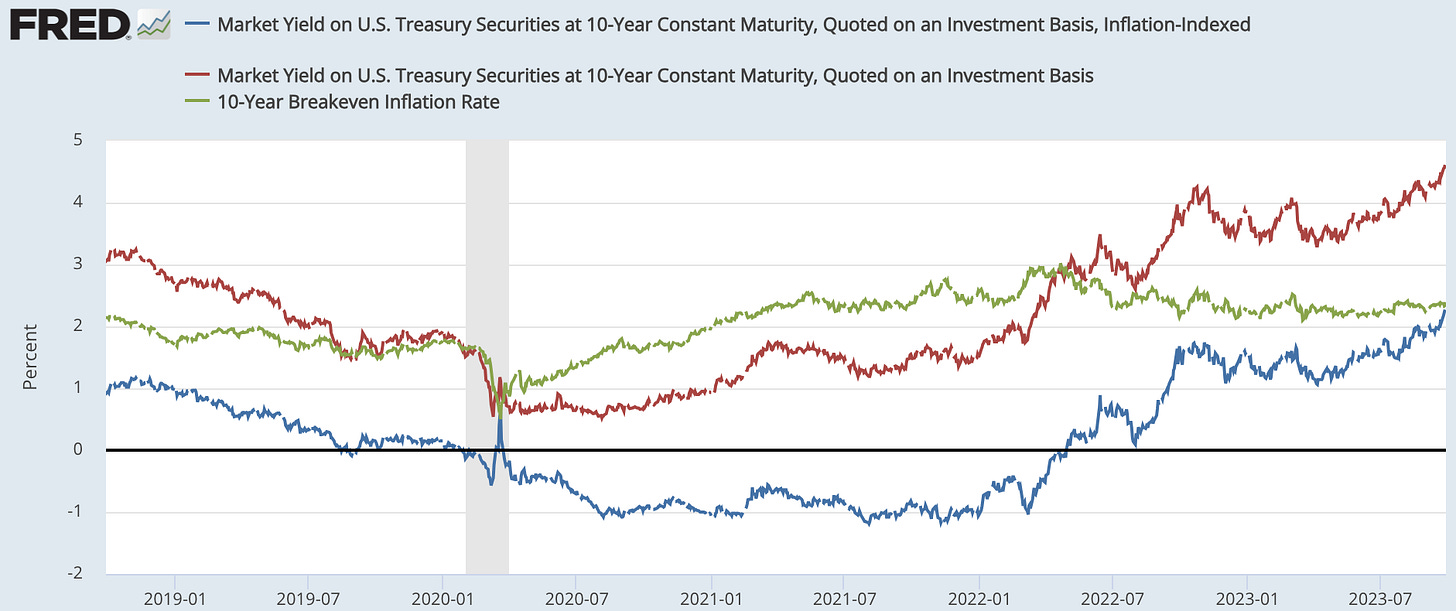 But that is really not the way that the news has been trending over the past six months. We have not been seeing nominal costs coming in higher and production coming in weaker than we had expected—which is what we would be seeing if the derisking-to-deglobalization train were barreling down the track. We have been seeing costs coming in lower and production coming in stronger than we had expected. That has been pushing up interest rates because the chances of “Fed overdoes it and then starts frantically cutting” have been going down substantially, as it becomes clearer that (a) the Fed’s moves so far have not overdone it as far as policy restriction is concerned and (b) there is little rationale for the Fed to take further austere steps that might overdo it in the future. But that is, I think, a different mental channel pushing up interest rates than what Larry Fink is worrying about.