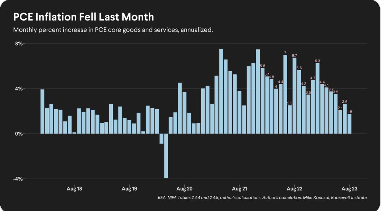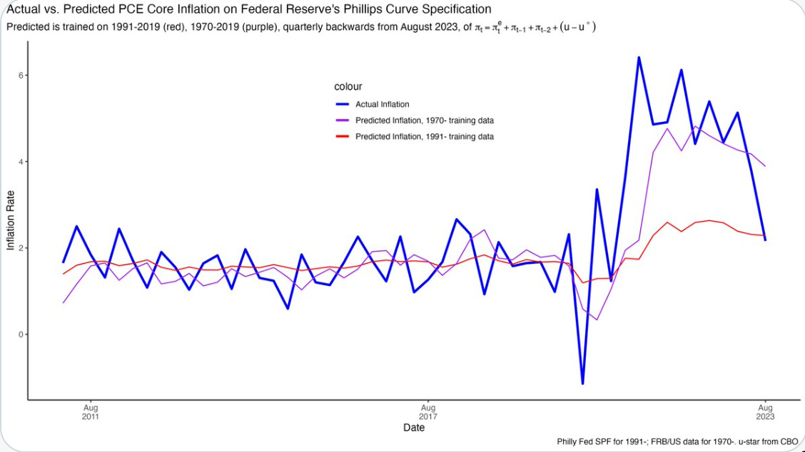 Mike Konczal: ‘Well that's about the best inflation print ever. Core PCE has a monthly value below 2 percent annualized (the Fed's target) for the first time since the lockdowns. But under the hood it's even better - it's all in the right directions. Let's dive in. This month had zero inflation in core goods and further slowing in services, especially non-housing services. This is exactly the scenario we want to see…. What is the Fed seeing? Well here's their favored Phillips Curve specification, trained on data from 1970- (stagflation model) and 1991- (Great Moderation model). Folks, we're back. It's right on the moderation line….