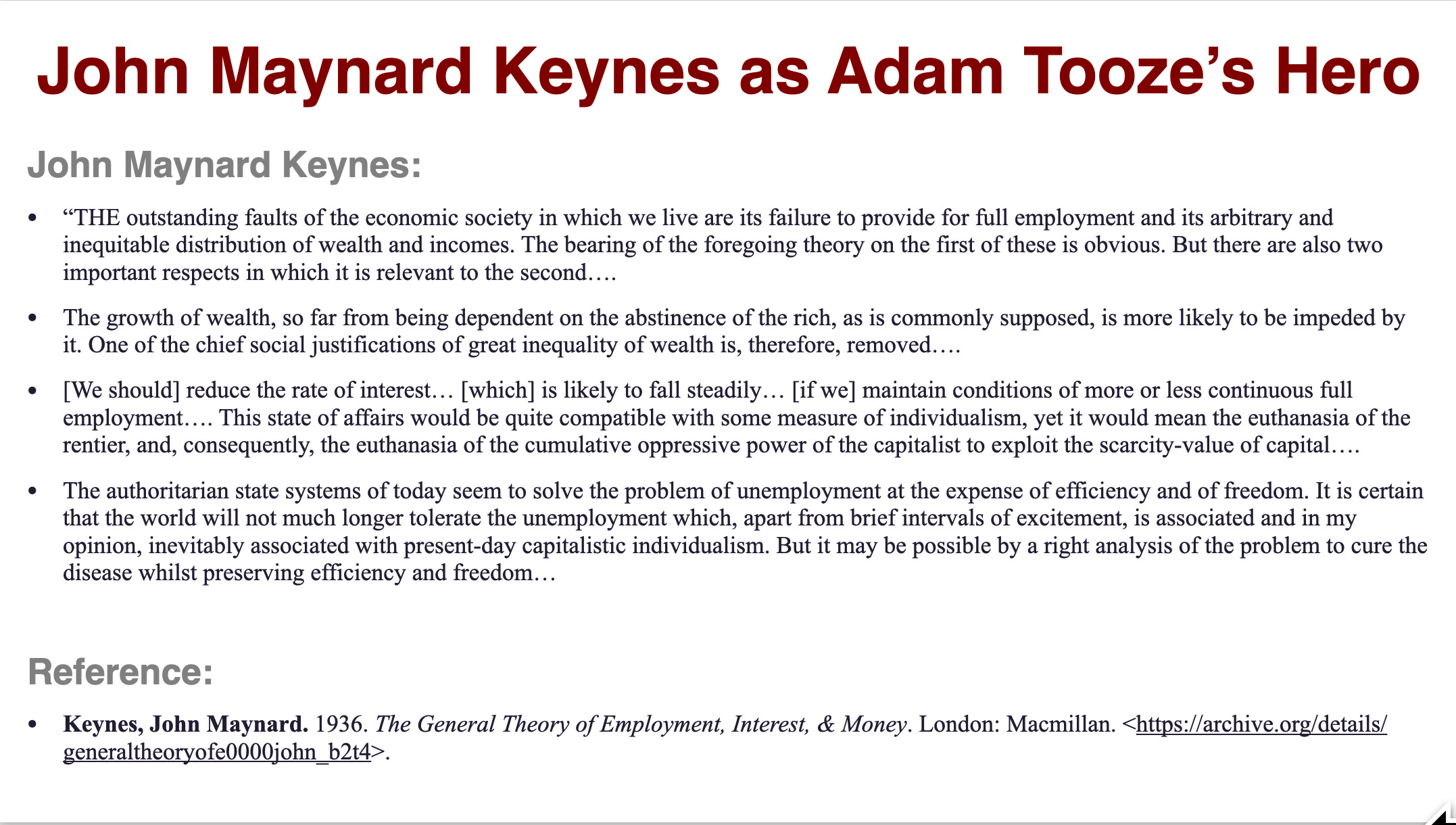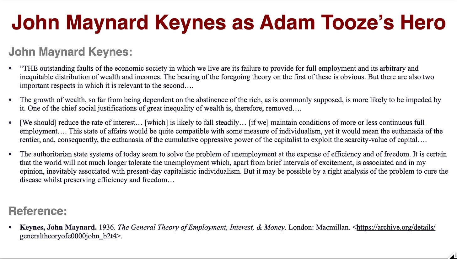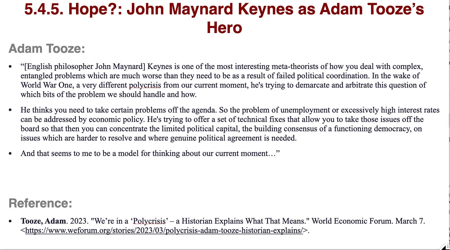 Let me conclude with two quotes, from Adam Tooze and John Maynard Keynes, giving us some hope. Keynes is one of Tooze’s heroes, and he looks to him for clues as to how to successfully surmount the polycrisis “challenges” of our current interregnum: