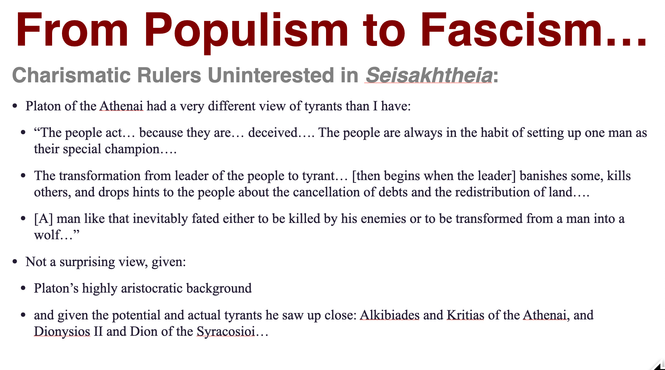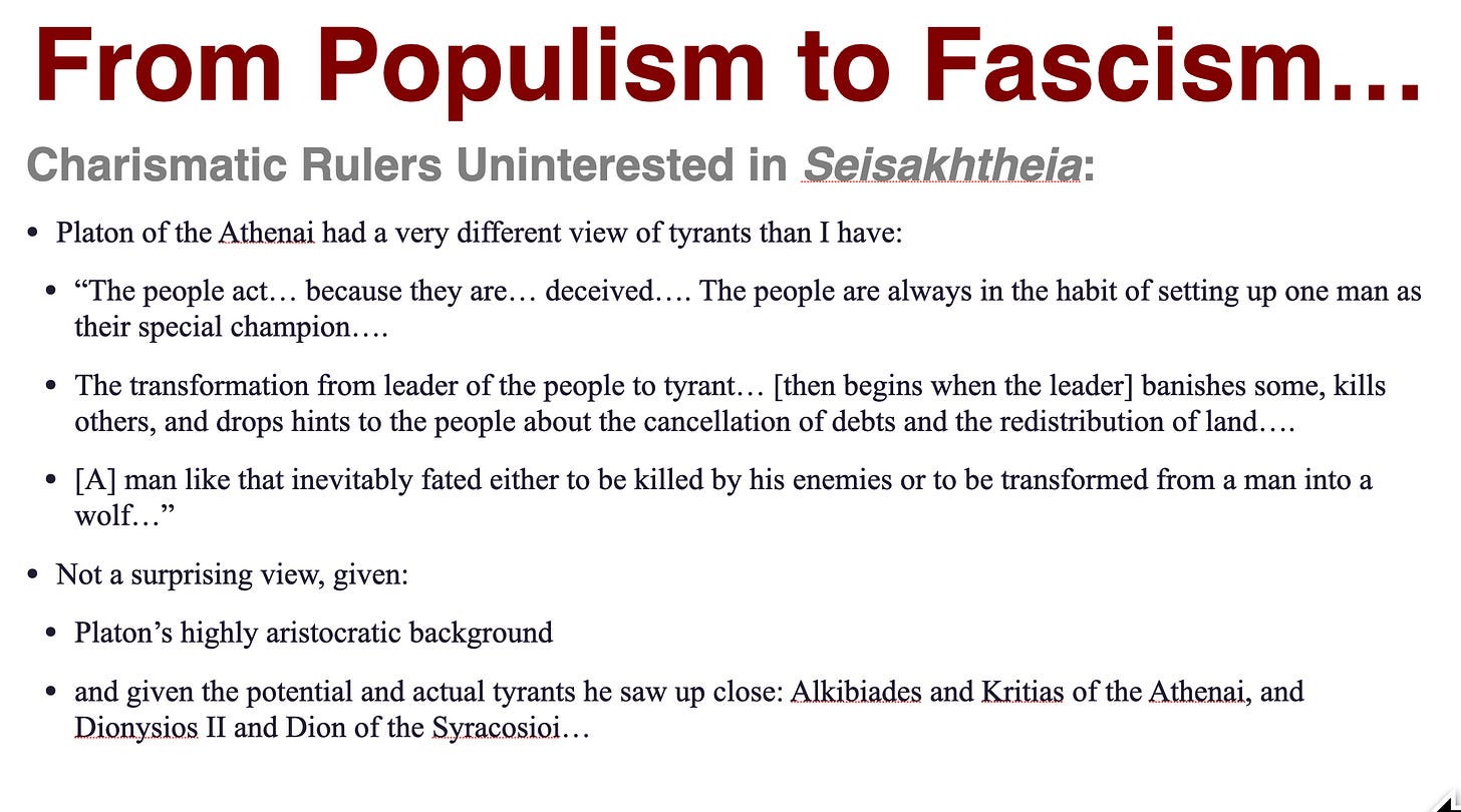 Yes, the F-word. I think it is appropriate. I think we need it. I think it is important to distinguish between whether populists are in it for the lifting of burdens from the people, those who have chosen the opposite of Team Oligarchy for instrumental reasons as a road to power, and those who have glorious purpose who seek to attach the people to that purpose—who believe that the happiness people ought to and are only truly satisfied is not some bottom-up utilitarian happiness of comfort and prosperity given what people want and think they need, but the happiness of participating in some collective project and attaining some collective goal chosen for them by the leader who tells them what they really need, and just what they want.