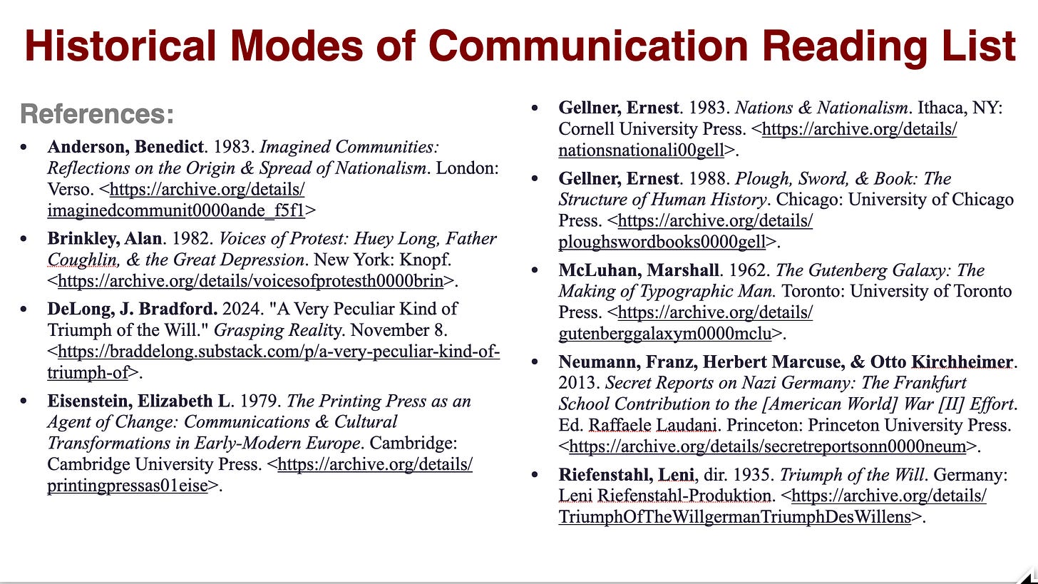 DeLong, J. Bradford. 2024. "A Very Peculiar Kind of Triumph of the Will." Grasping Reality. November 8. <https://braddelong.substack.com/p/a-very-peculiar-kind-of-triumph-of>.