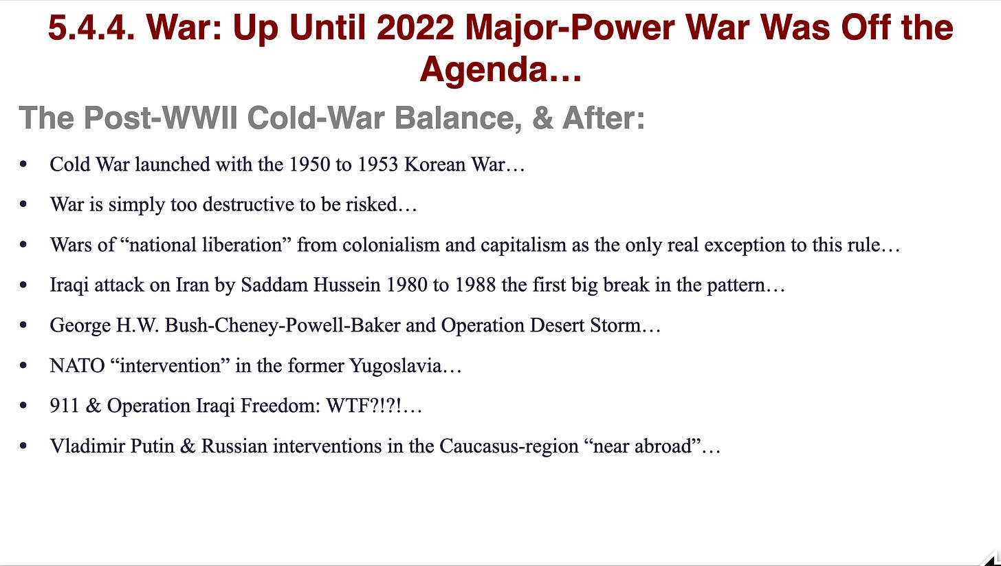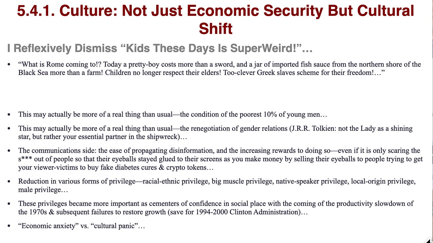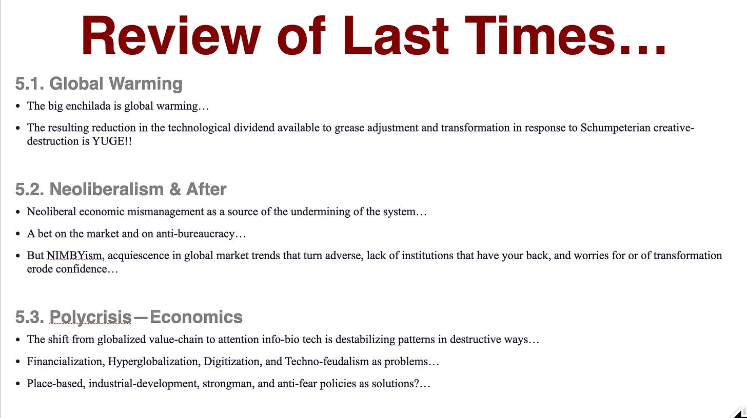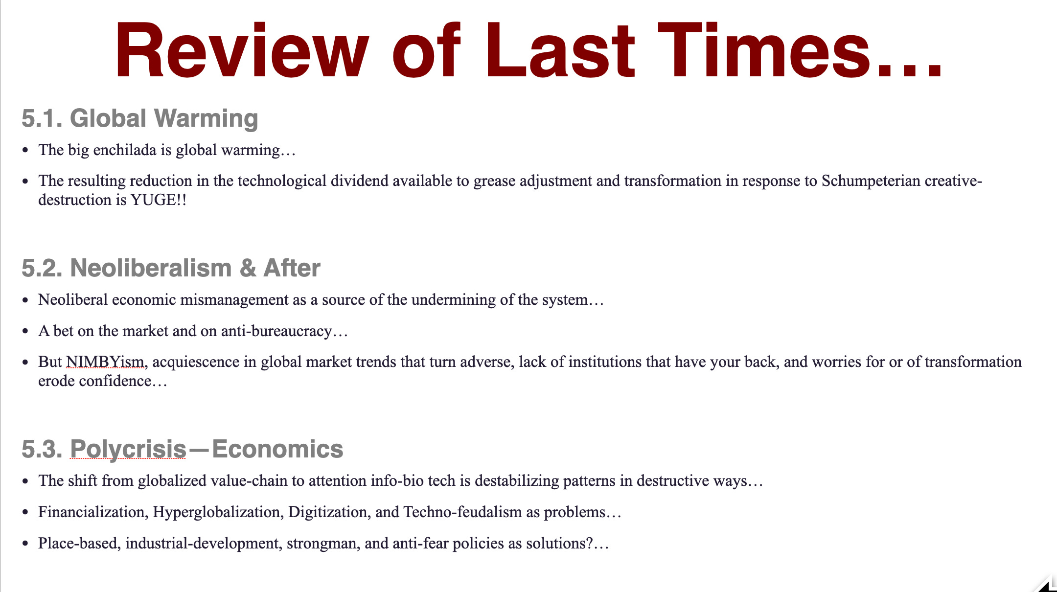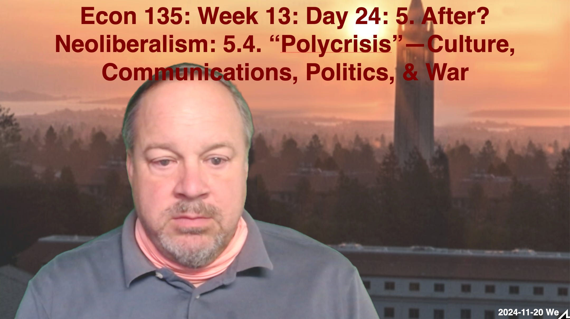 Most recently in 5.3. Post-2010 “Polycrisis”: Economics we took a look at the economic aspects of what Columbia historian Adam Tooze has taught us to call the "polycrisis". Now in 5.4. Post-2010 “Polycrisis”: Culture, Communications, Politics, & War we will quickly cover the cultural, communicative, political, and military dimensions of the polycrisis. And then in 5.5. The Renewed Fight Over Systems & Orders we will discuss the renewed debate over economic and political orders and systems that we are having in this current interregnum, after the fall of the Neoliberal Order, and before whatever comes next, in the context of what appears to be a shift from the age of the Globalized Value-Chain Economy to an age which may be one of the Attention Info-Bio Tech Economy—and will be the age of Global Warming.