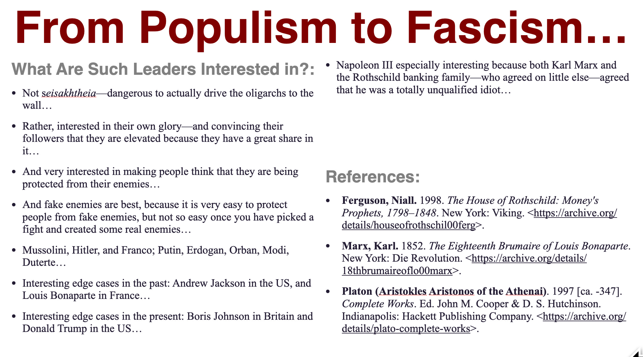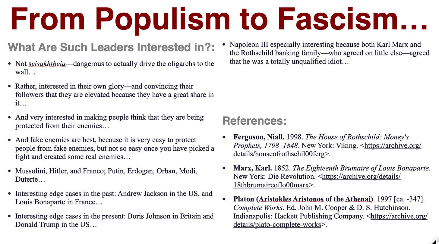 And then there are those I have a hard time classifying: Strongman, yes, but populist, pragmatist, or fascist? Two such from the past are Andrew Jackson in the United States in the 1830s and Charles Louis-Napoleon Bonaparte in France in the 1850s are interesting edge cases that often puzzle people in terms of which political side they represented. Two such I find puzzling in the present are Britain’s Boris Johnson and America’s Donald Trump: interesting edge cases in the present political landscape. Boris Johnson is especially puzzling: he was not very pragmatic in power, the enemies he promised to protect the British people from—bureaucratic Europeans—were totally fake—yet when he became totally dominant Prime Minister of Britain he had absolutely no idea what he actually wanted to do with his power, no idea of either what the prosperity of the people or his own glory required.