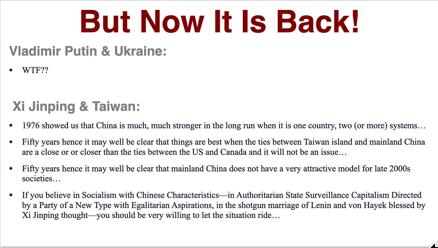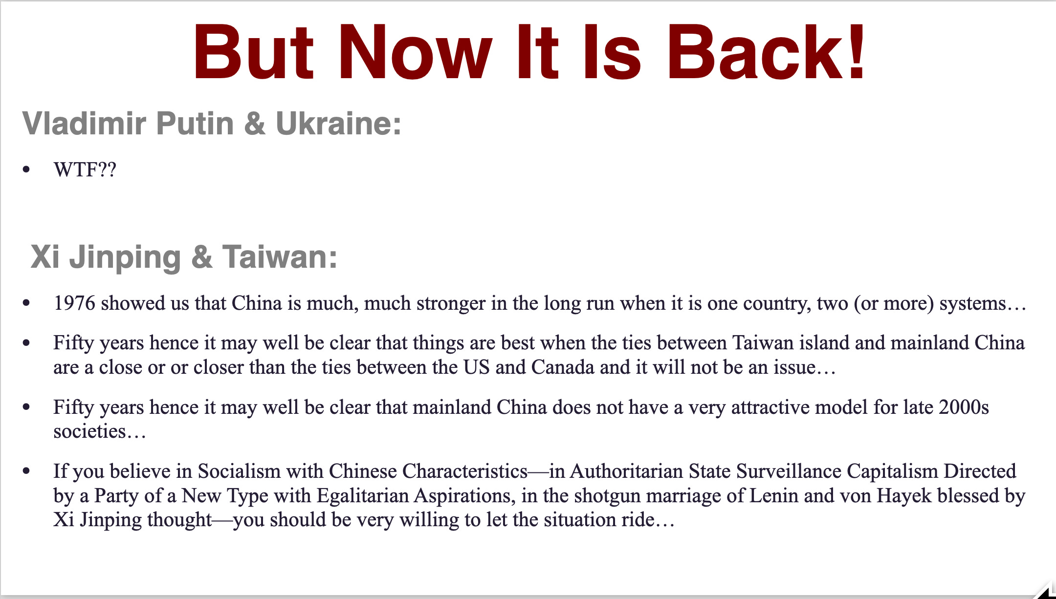 In fifty years, one of two things will be clear. Perhaps China will be a rich great-power success, with Socialism with Chinese Characteristics—Authoritarian State Surveillance Capitalism with a Leninist Party in Command and Egalitarian Aspirations—a great success as well, in which case Taiwan and the rest of China will be as interdependent and have as little to argue over as the United States and Canada, and the issue will seem quaint. Or Socialism with Chinese Characteristics will fail—in which China will need alternative systems not just economic but political as well more badly than ever.
