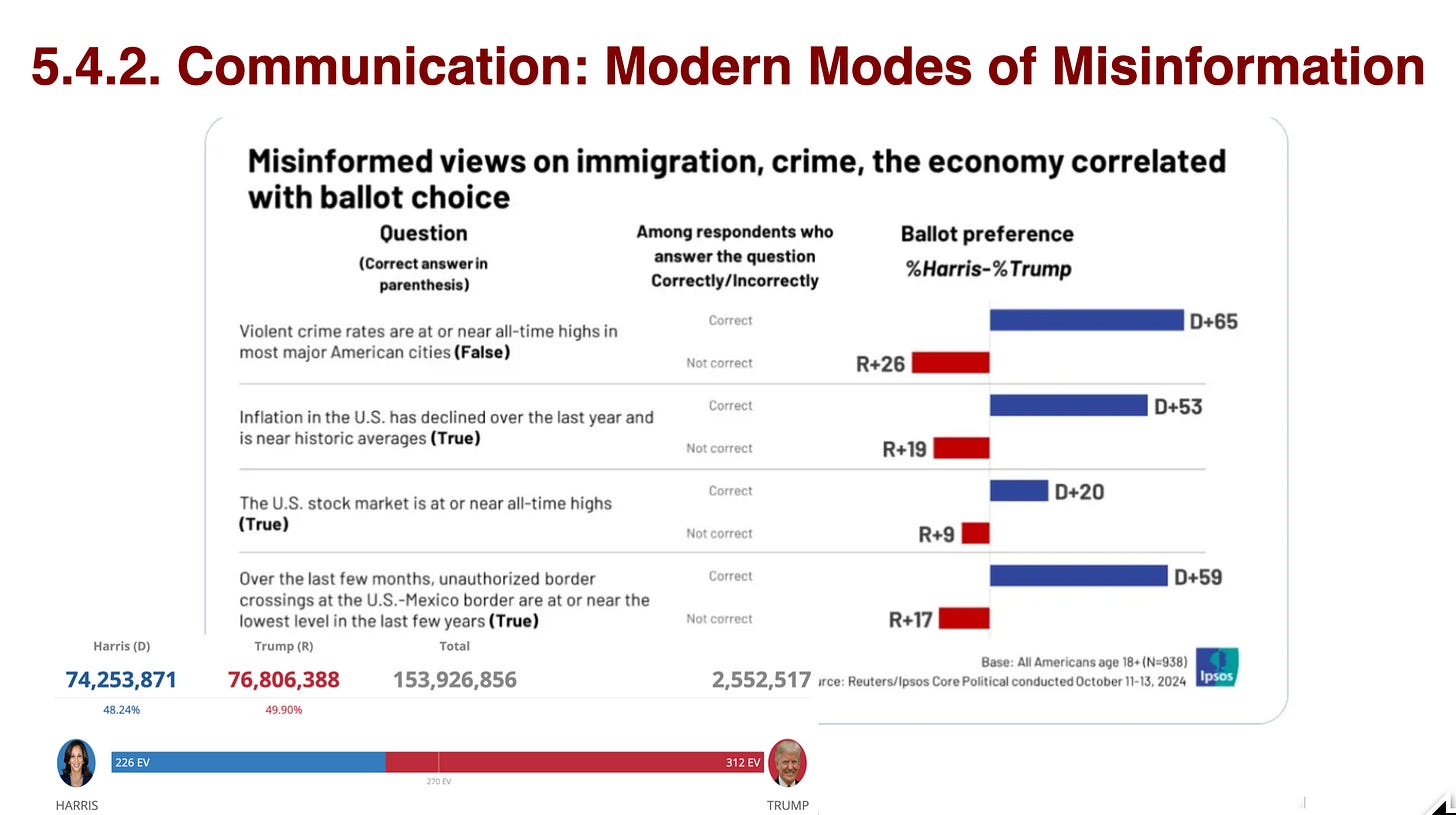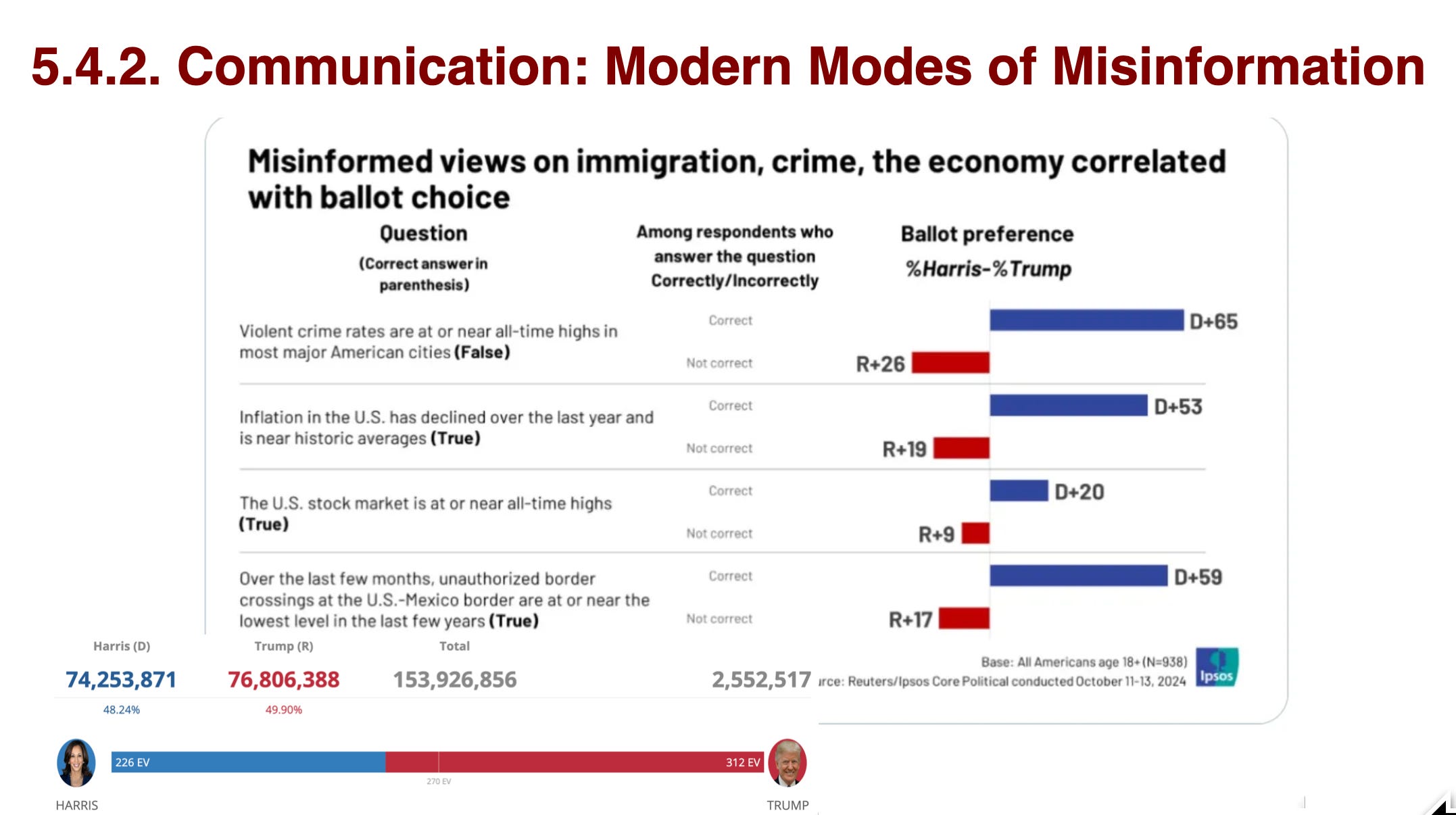 The recent election was extremely close. The margin between the candidates was very narrow. The last vote totals I saw showed Kamala Harris with 48.24% of the vote and Donald Trump with 49.9%, and the slower arrival of the vote count from the Pacific Ocean states means that that margin is going to shrink further. In such a close vote, each small factor made the decisive difference. But misinformation and its correlation with voting intentions is not a small but rather a very big factor.