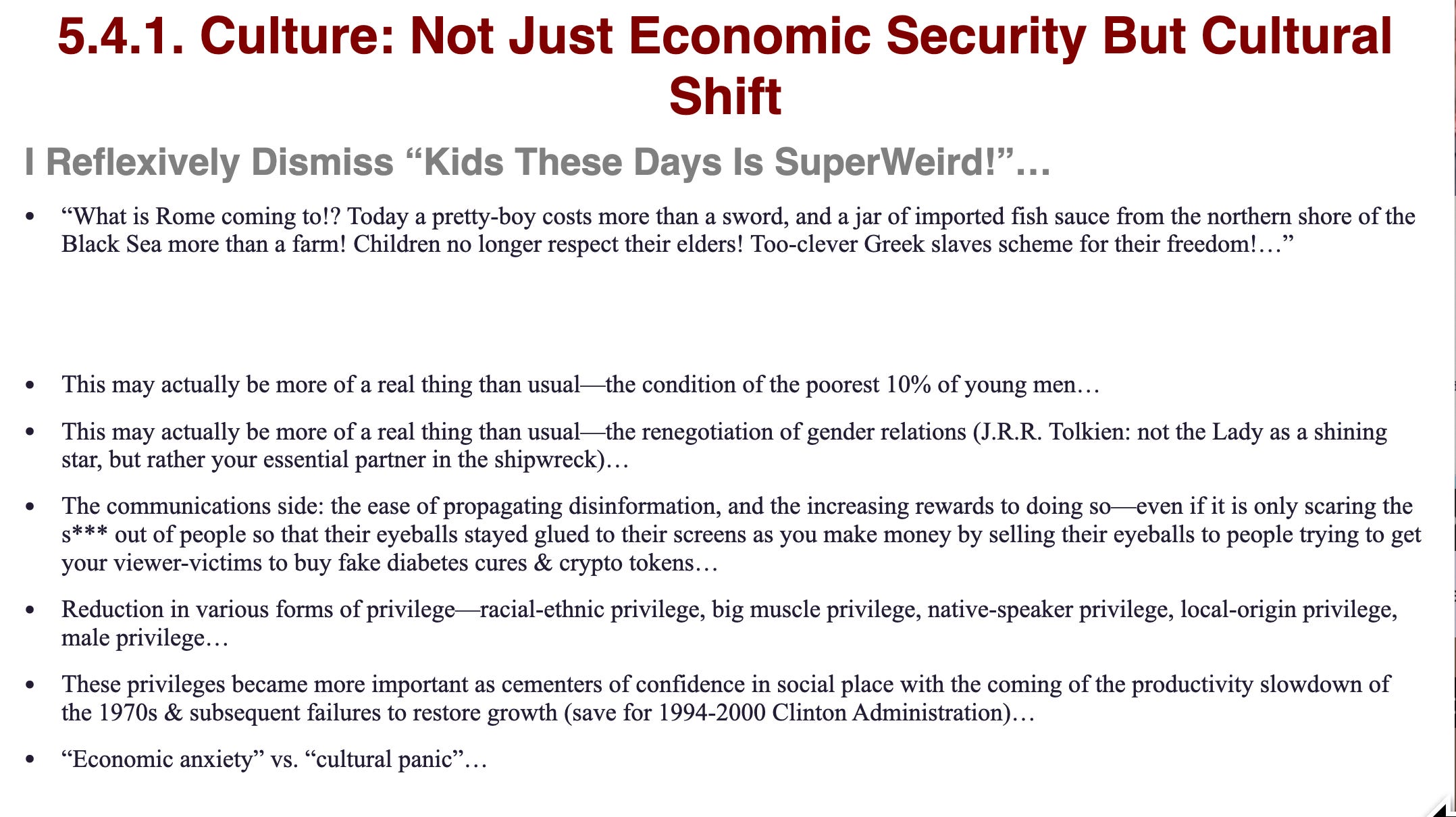 I have always had a hard time taking “cultural panic” seriously. It sounds to me like something we have been hearing for the last two-thousand years, and for the two-thousand years before that. There are always grumpy old men yelling at the clouds about how things today are worse than the old days when children respected their parents and when—as the oligarchs of the late Roman Republic put it—as was proper, a sword cost more than a pretty-boy slave, and a farm cost more than an imported jar of fish sauce made on the northern shore of the Black Sea. Grumpy old men yelling at clouds seems a constant in human society. With an again society, we have more old men to be grumpy.