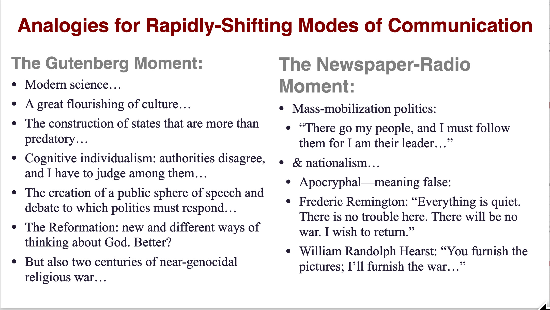 A second historical analogy: The coming of mass media—first newspapers and then radio, at the same time as the coming of Modern Economic Growth was a further step-change in the cost and pace of communication. Politics could shift from being a network-based, top-down process to one subject to a more direct form of mass mobilization. Instead of decisions flowing down through layers of personal connections, mass media allowed politicians and others to speak directly to large public audiences. Increased political mobilization on a wide range of issues had effects both positive and negative as it transformed the nature of the political process.