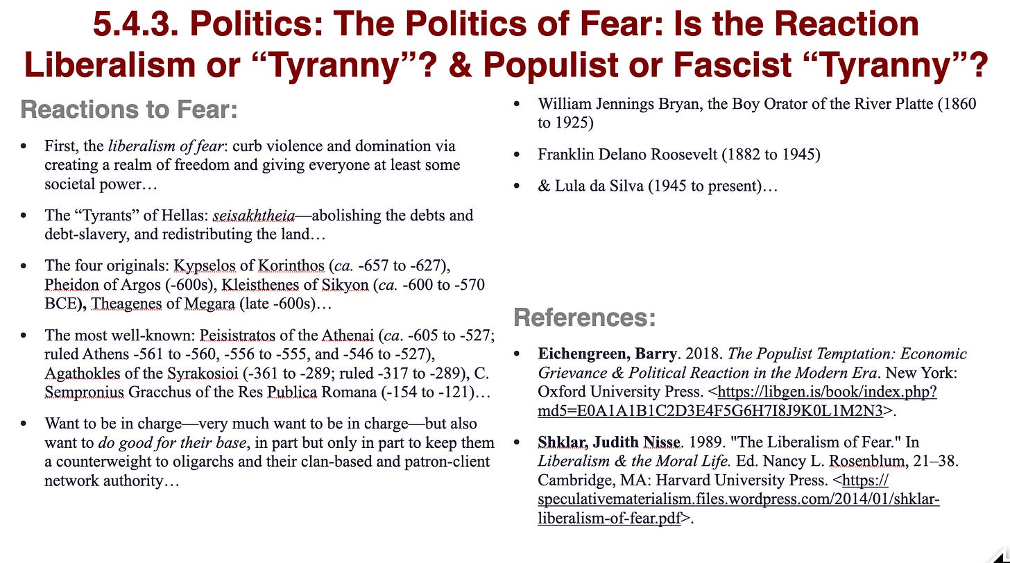 In Corinth, Argos, Sikion, in Megara, and later far and wide, with the most famous of these tyrannoi, these Strongmen, being Peisastratos of the the Athenai and Agathokles of the Syracosioi—and later the failed and assassinated C. Sempronius Gracchus of the Res Publica Romana. To those who actually wanted redistribution and general prosperity as much as to gain and wield power we can add William Jennings Bryan and Franklin Delano Roosevelt as having the same aims but different, constitutional means. And, I think, Lula da Silva in Brazil, though it remains to be seen whether he will ultimately be judged as a successful leader.