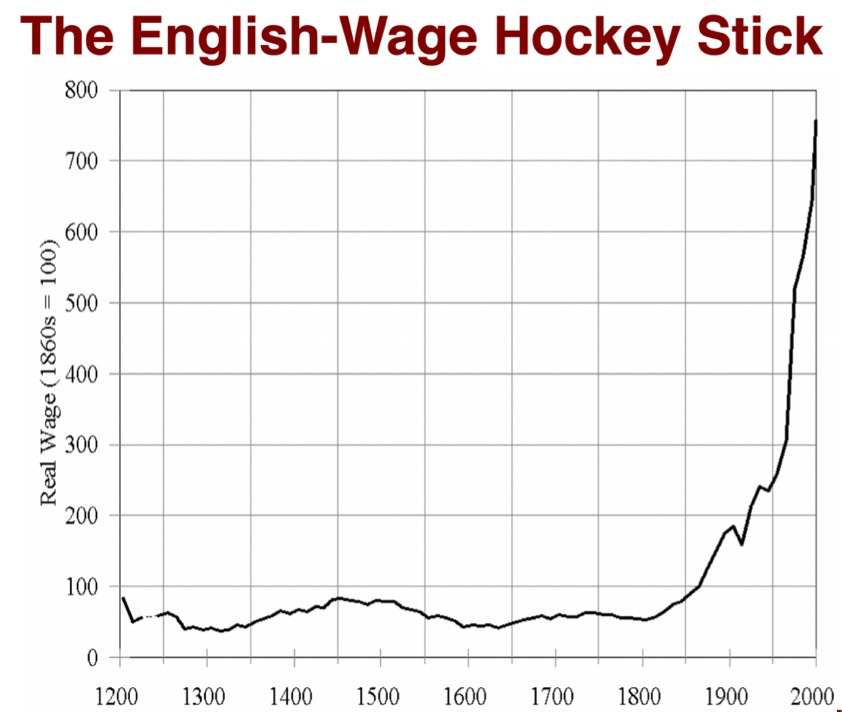 We have good data on average income levels from Greg Clark. They show average income levels—the wages the church paid to construction workers, minus the prices the church paid for staple necessities—stagnant, although with considerable variation by a factor of nearly two, from 1200 to 1850: