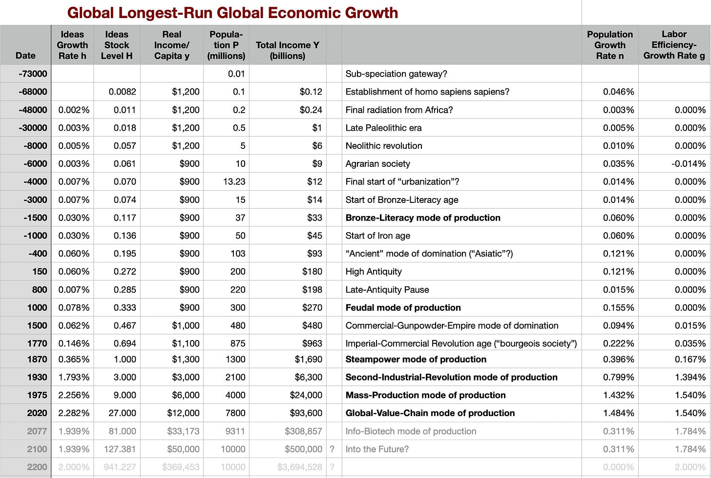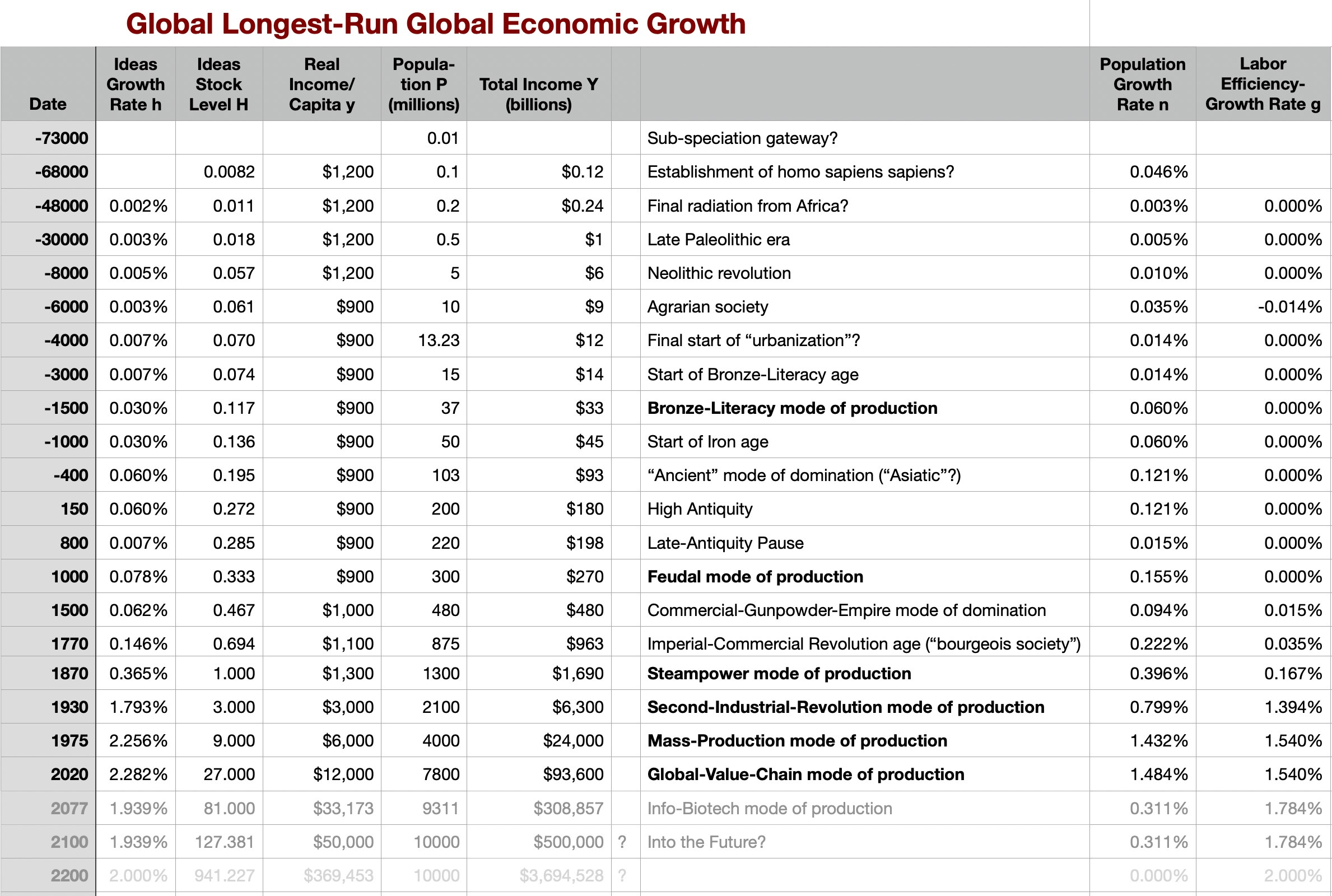 Why take the square-root? Well, if we just multiplied average income by population—called total world real income “technology”—we would be implicitly assuming that labor is useless and unproductive. But that cannot be right: each mouth comes with two eyes, two hands, and a brain. If we just took average income—called that “technology”—we would be implicitly assuming that natural resources are unimportant, and that it does not matter how small population growth has reduced the size of the average plot of land on which a typical person’s food is to be grown. That also cannot be right: resource scarcity, and attempts to compensate for it, are a very real thing in our world, today and in our past.