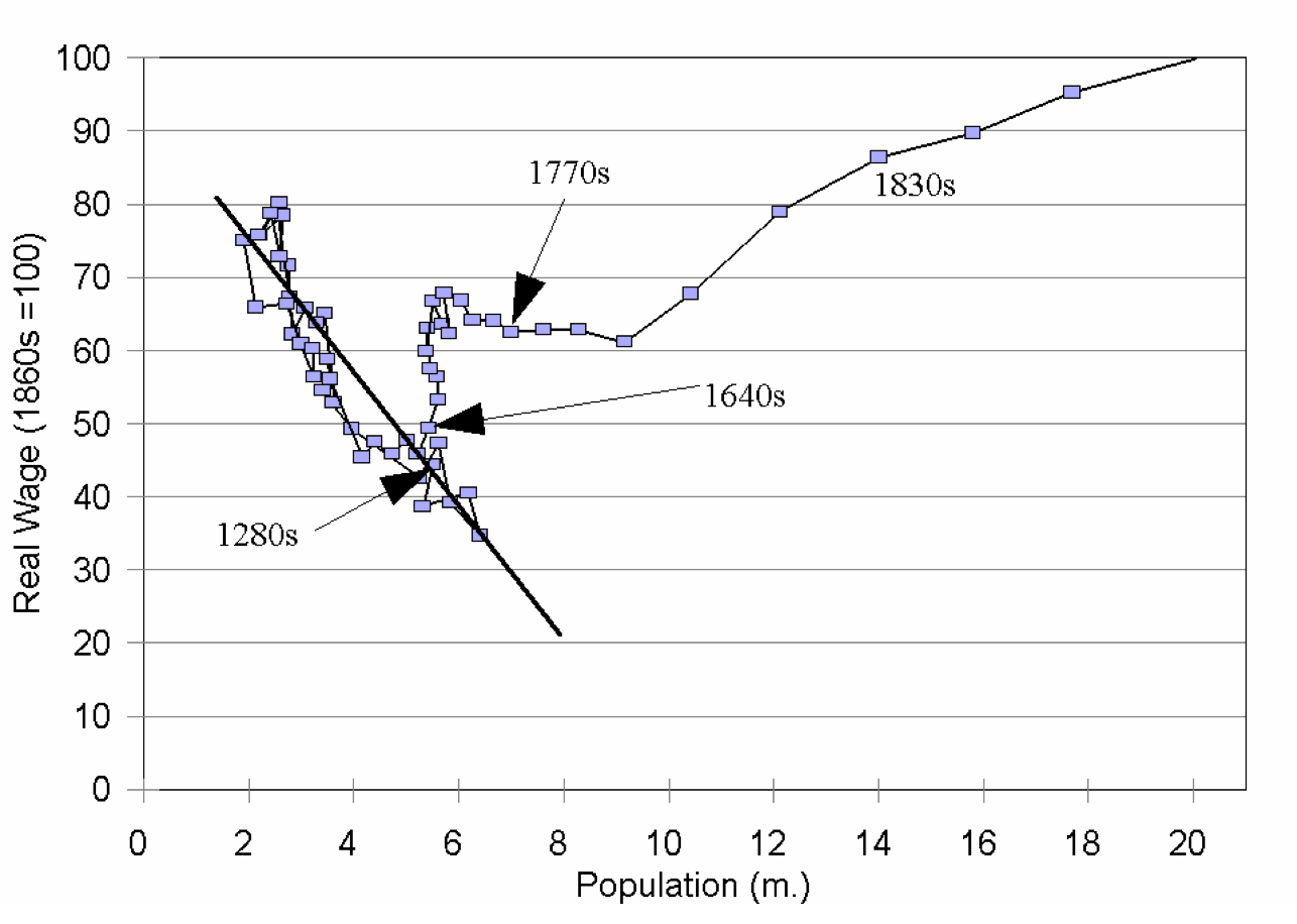 Does this not remind you of what we know about British population and wages from the medieval era up through 1700 or so? From Greg Clark’s The Condition of the Working Class in England: