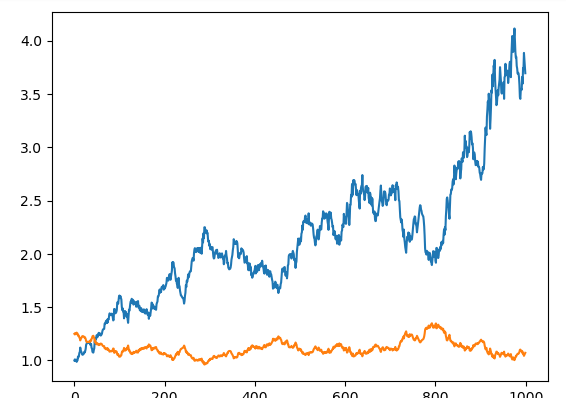 The first graph plots time on the horizontal axis. On the vertical axis is the population of our simulated society over 1000 years, starting at an initial index value of 1, in blue; and also on the vertical axis is the productivity level of the economy over 1000 years, starting at an initial value 25% above the 1.0 benchmark of “subsistence” at which population is stable. Population grows erratically, because of the random shocks, but substantially over 1000 years. The economy’s productivity level does not: it stays near one, and pretty much all you can say is that productivity is relatively high after an extended period of population stagnation or decline, and low after an extended period of faster-than-average population growth: