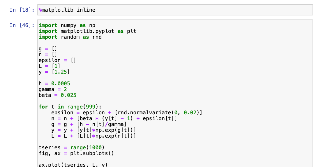 Then we are going to tell Python that it is going to have to keep track of five lists of numbers—the list of productivity growth rates g, of population growth rates n, of the labor-force level L (with L starting out at a benchmark index level of 1), of the productivity level y (with y starting out 25% above the subsistence level y = 1), and the list of random shocks to population ε.