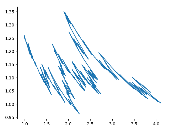 And here is productivity on the vertical axis plotted against population on the horizontal axis. In terms of time, the (population, productivity) pair for the economy is initially in the upper-left corner of the figure: at (1.0, 1.25). It then swings down and to the right and back up and to the left, all the while slowly moving right as technological knowledge accumulates:
