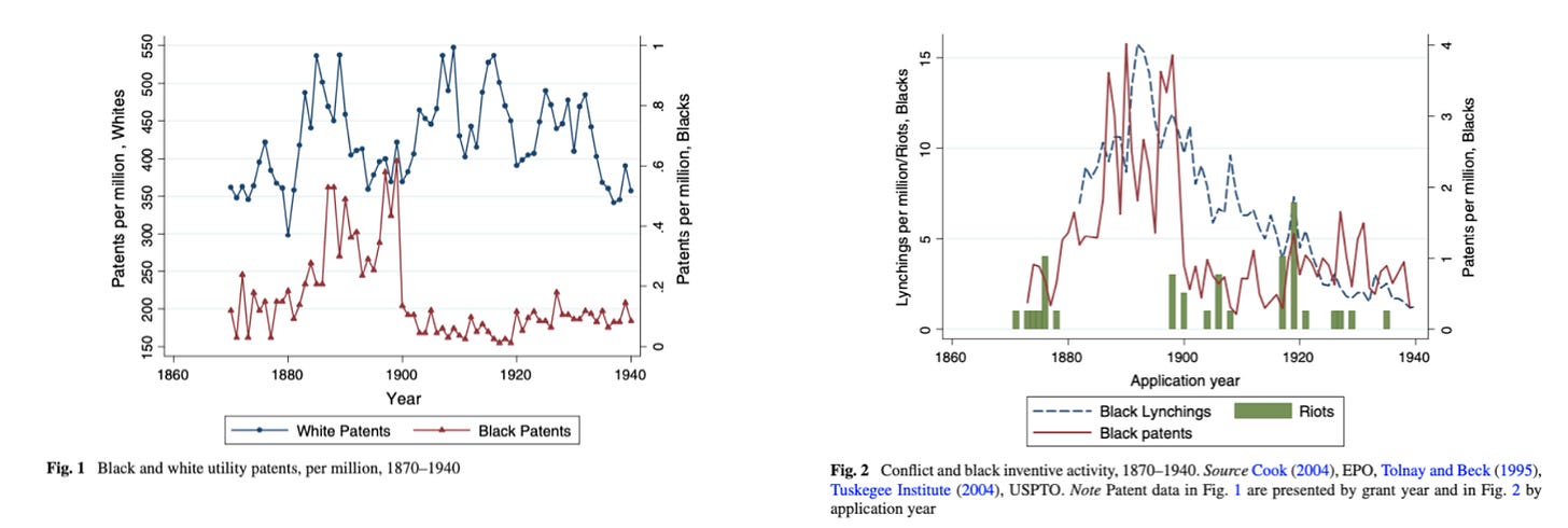 Paul Romer: Theories, Facts, and Lisa Cook: ‘I proposed a theory…. In a paper available here or here, Lisa presents evidence… about a crucial point that this line of reasoning [of mine] missed. She used patenting as a proxy for the activities that spur growth and assembled convincing evidence that there is another part of the legal system that has a bigger effect: the degree to which it creates a climate of personal security by protecting citizens from the threat of violence…. The gist of Lisa’s paper is conveyed in two figures. The first presents patenting rates for black inventors and the control group, white inventors…. The second shows the timing of violence against Blacks during these years. The surprise for me was the size of the effect on black patenting at a time when the control group of white inventors shows no comparable change. Had I considered the effect that changes in personal security can have on an activity like patenting, I might have concluded that it could have some effect, but I would not have expected the effect to be so large. After Lisa’s evidence forced me to think again about how easy it is to take personal security for granted and about the profound effect that a lack of personal security can have on optimism and a willingness to invest in the future…. Growth theorists could learn a lot by looking beyond the degree to which a system of law provides protection for contracts and intellectual property rights and evaluating the degree to which it creates a climate of personal security….