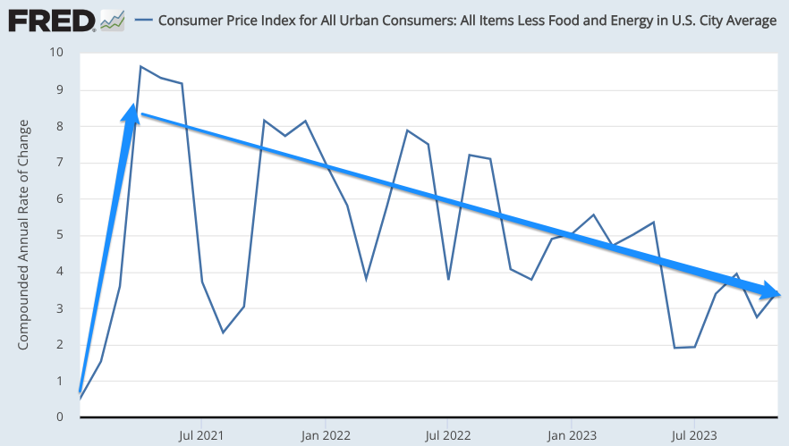 A headline “Inflation Is Fading. Will It Last?” <https://www.nytimes.com/2024/01/03/business/economy/inflation-prices.html> asks a question. A few hints are dropped along the way. But the question is not answered until the last three paragraphs of the story, paragraphs twenty-five through twenty-seven, in which Jeanine Smialek gives the mic is given to Omair Sharif who concludes: “There’s not a lot of upside risk left”.
